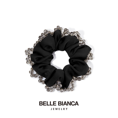Elegant Hair Scrunchie with Grey Crystals Surrounding Black Satin